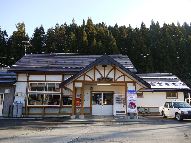 山あいの中の小さな駅という感じです。長旅を考慮してか、近くの商店に買い出しに行く人も。