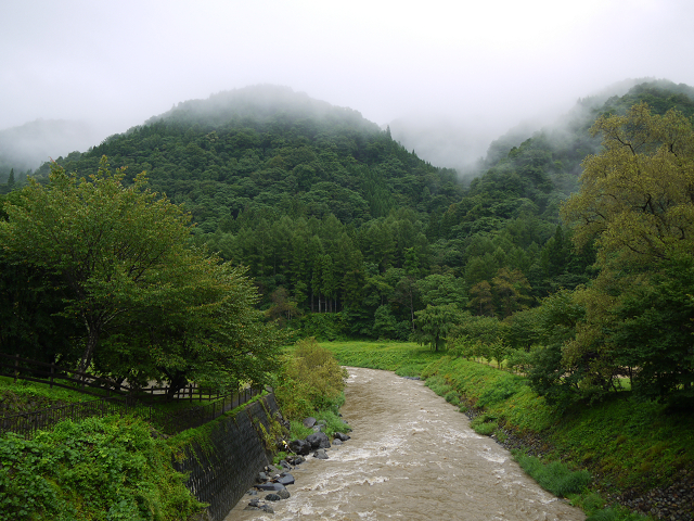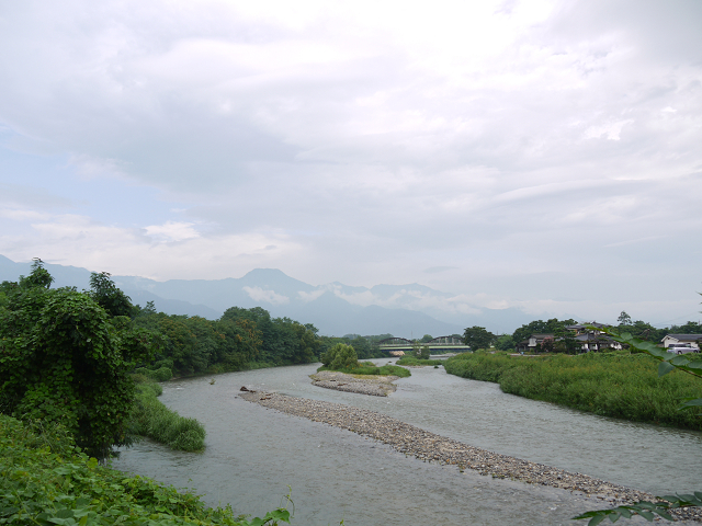 川沿いの風景も美しい。遠くには信濃富士の有明山が。