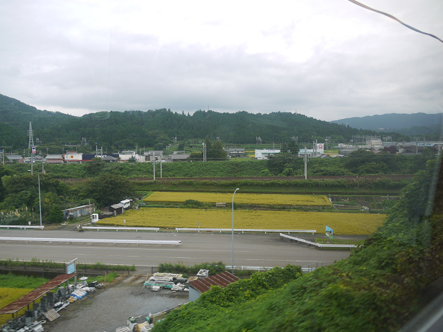 田んぼの奥に見えるのが上り特急列車と上下の普通列車の通るメインの線路でしょうか?