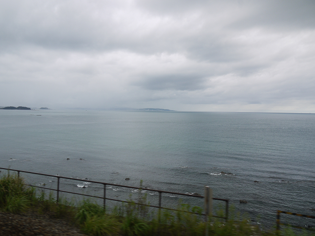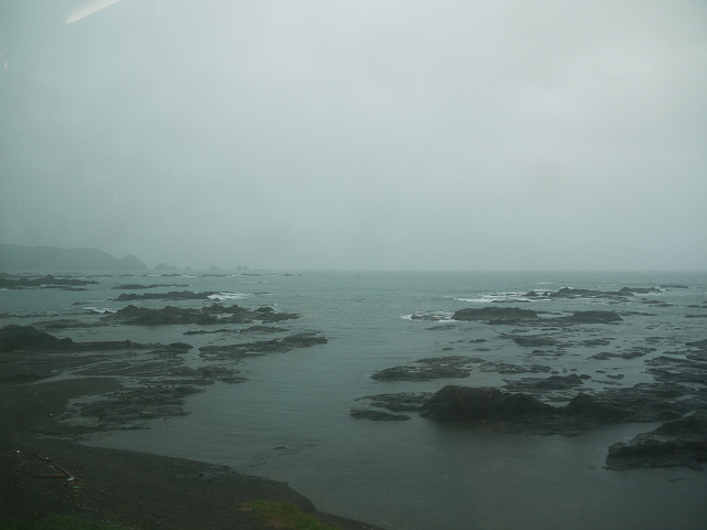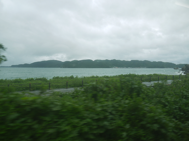 串本を出ると海すれすれを行きます。自然の造形美で大きな岩が並んでいるところがあったりと景色は素晴らしいです。ただ天気が…。今回も雨です。しかも台風接近。