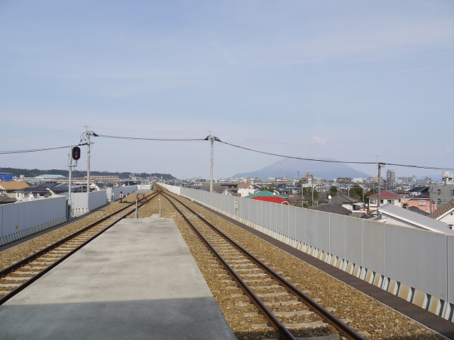 ホーム北端(鹿児島中央方面)からは桜島が見える。