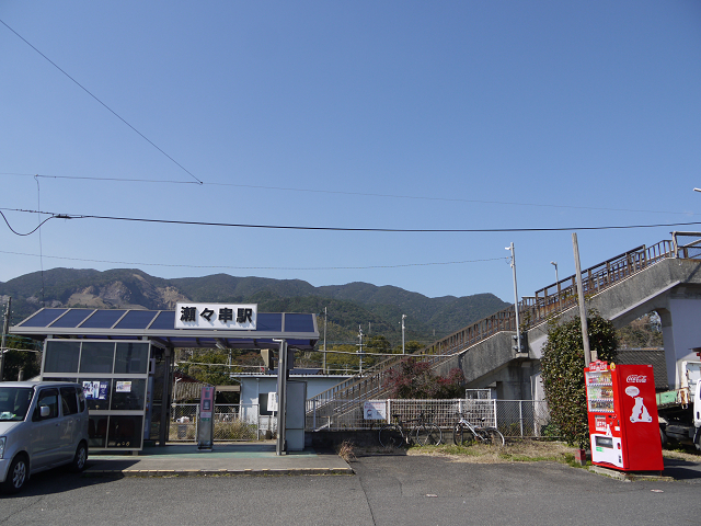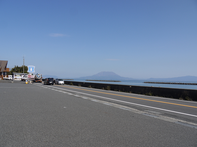 駅を出たらすぐコンビニがあり、国道226号線も走る。鹿児島湾も近く、遠方には桜島が。