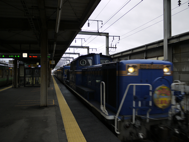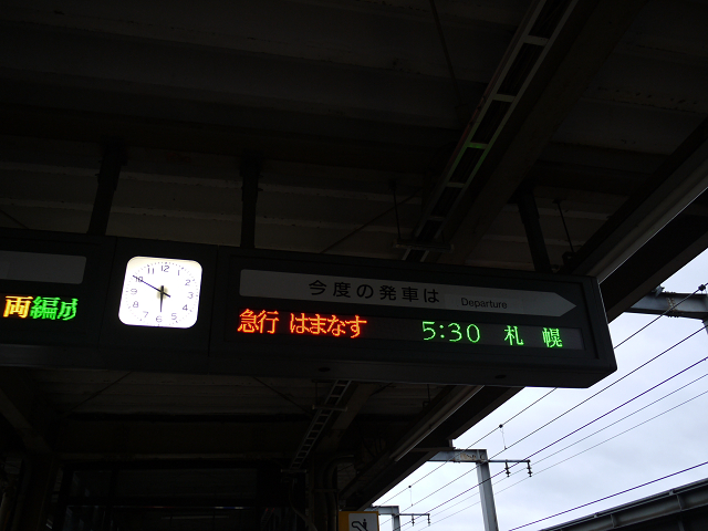 早朝に千歳駅を出発。まずは札幌駅まで行きます。やってきたのはなんと急行はまなす。2009年の列島縦断旅以来の乗車です。電光掲示板の発車時刻と実際の時計の時刻との違いから察するに、遅れての到着だったんですね。